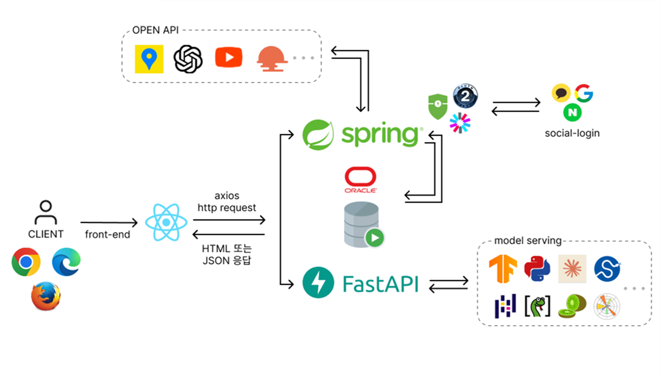 | 팀 성과 | 소셜 로그인 이메일 인증 영상,음성 인식 및 분석, 결과 여행상품 게시 및 검색, 검색어 기반 유튜브 영상 추천 날씨, 지역행사 API를 통한 지역별 정보 제공 OCR을 활용한 가이드 인증 기능 가이드, 고객 일대일 실시간 채팅 및 알림 chatGPT기반 챗봇 |